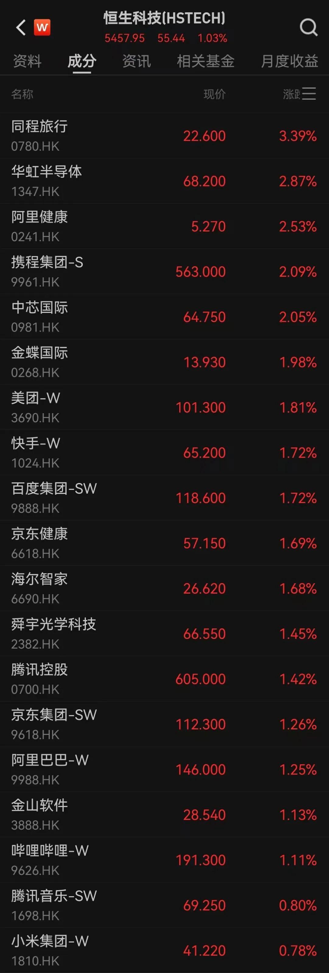 百度集團(tuán)、騰訊控股、阿里巴巴漲超1%,美團(tuán)漲近2%,阿里健康漲超2%。