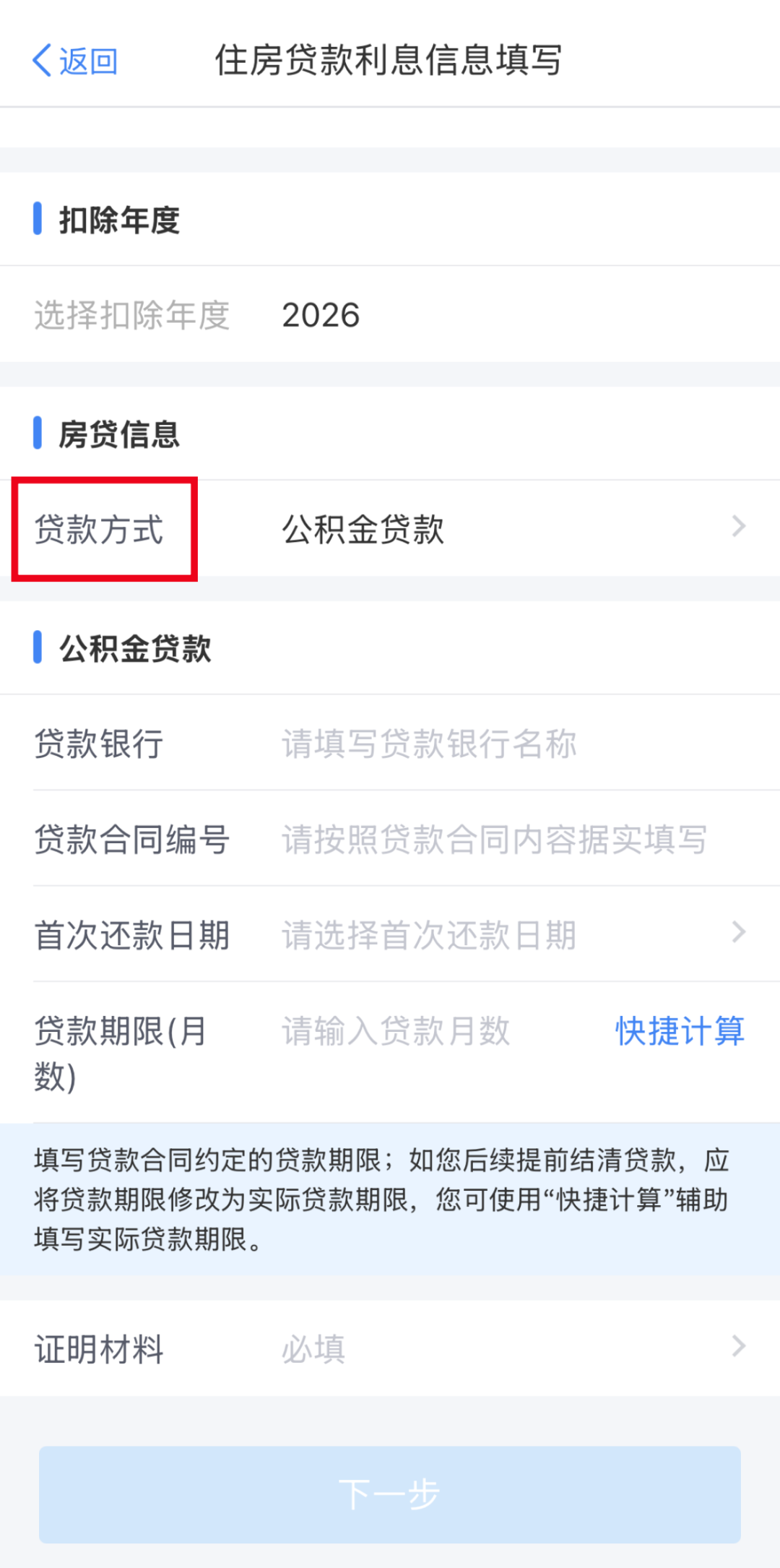 選擇“貸款方式”,填寫貸款信息,點擊“下一步”;