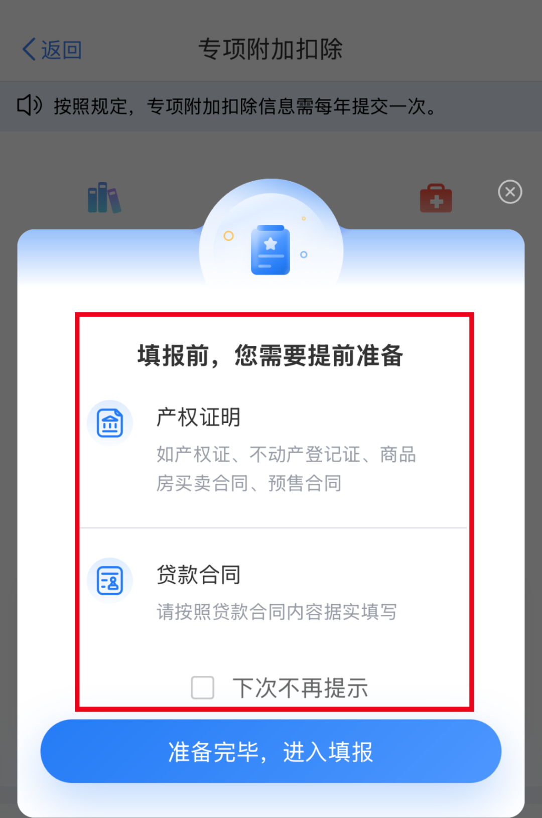 準備好“產(chǎn)權證明”“貸款合同”等相關資料,點擊“準備完畢,進入填報”;