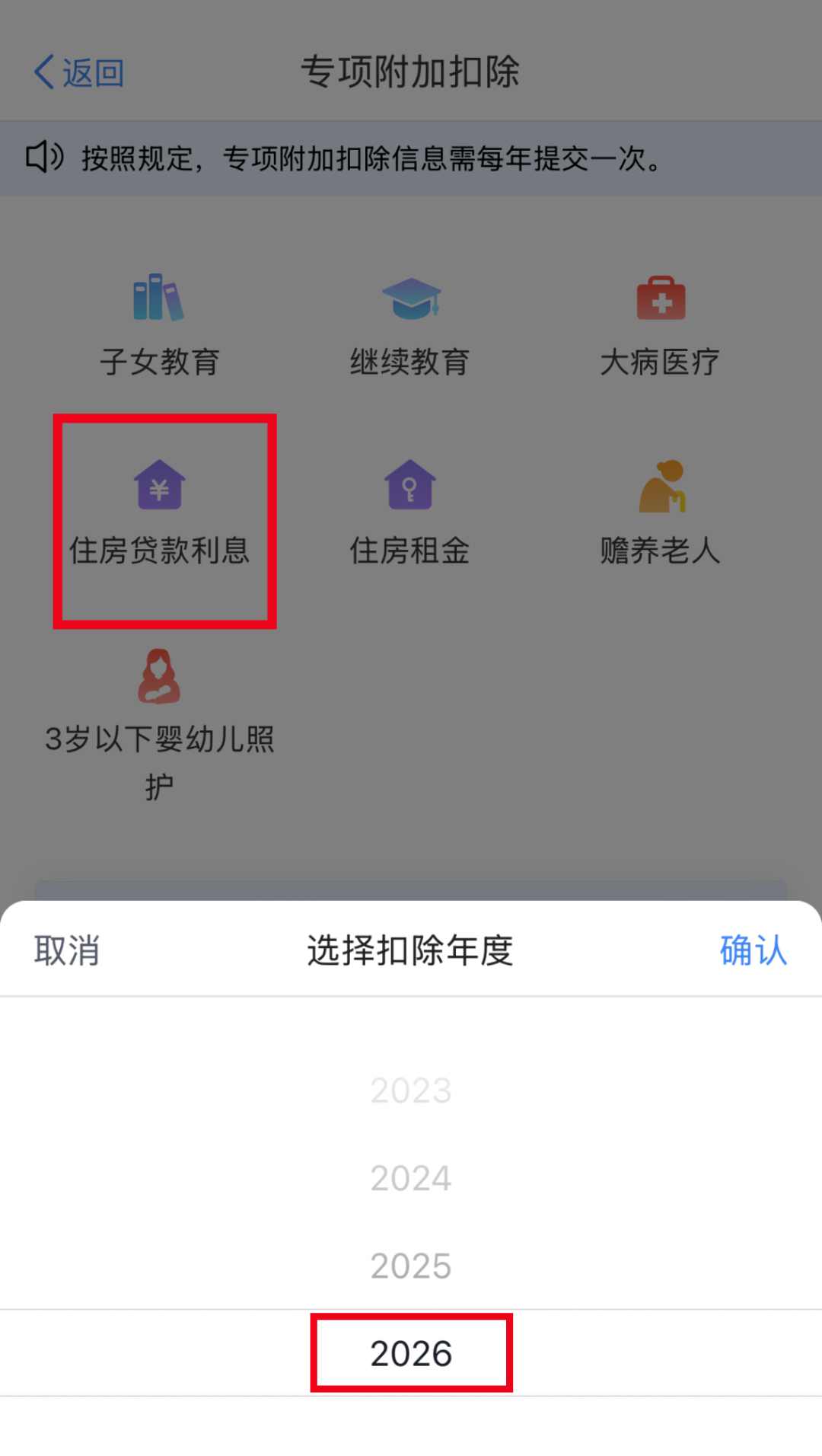 選擇“住房貸款利息”“扣除年度”,選擇“2026”,點擊“確認”;
