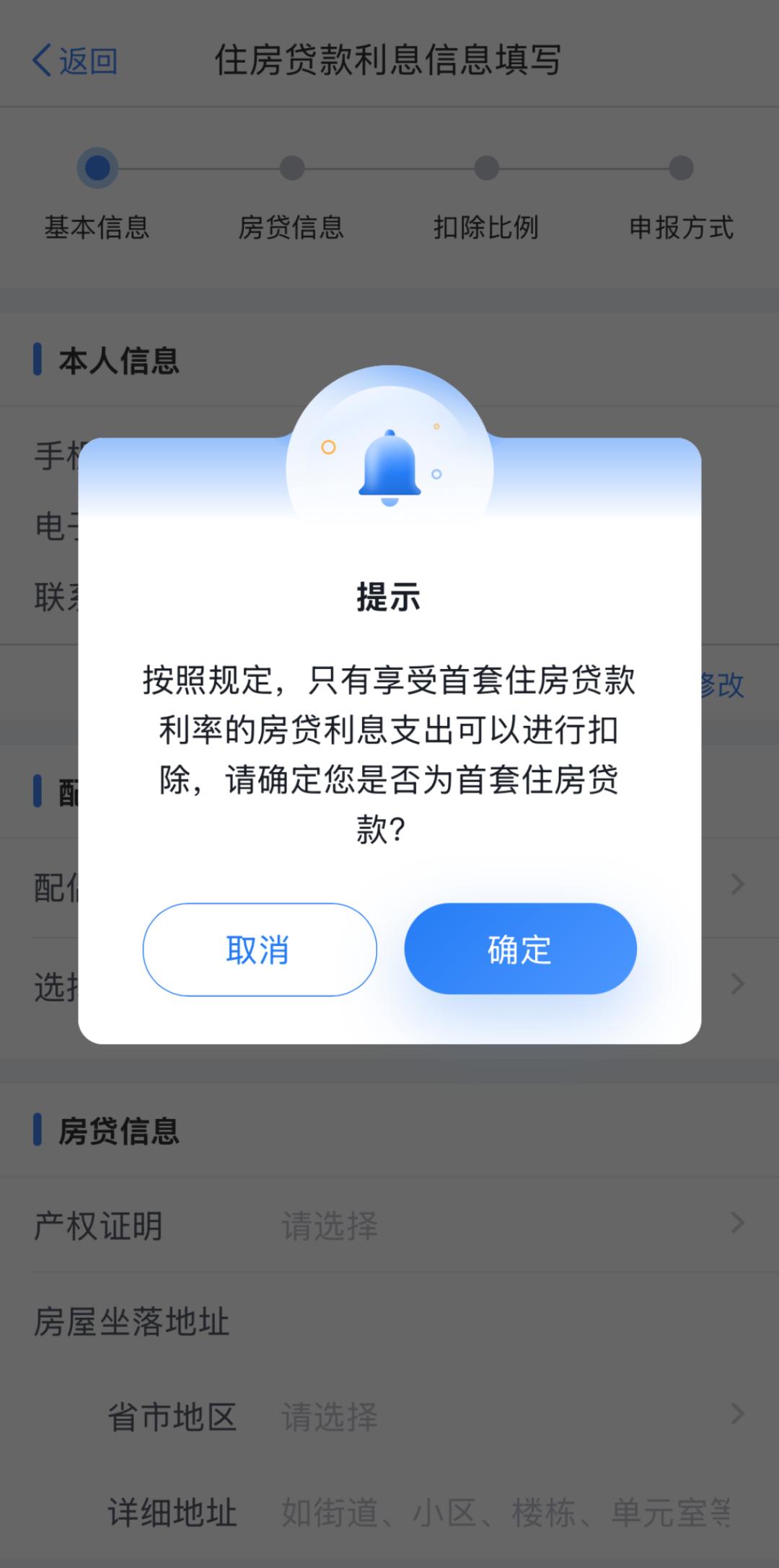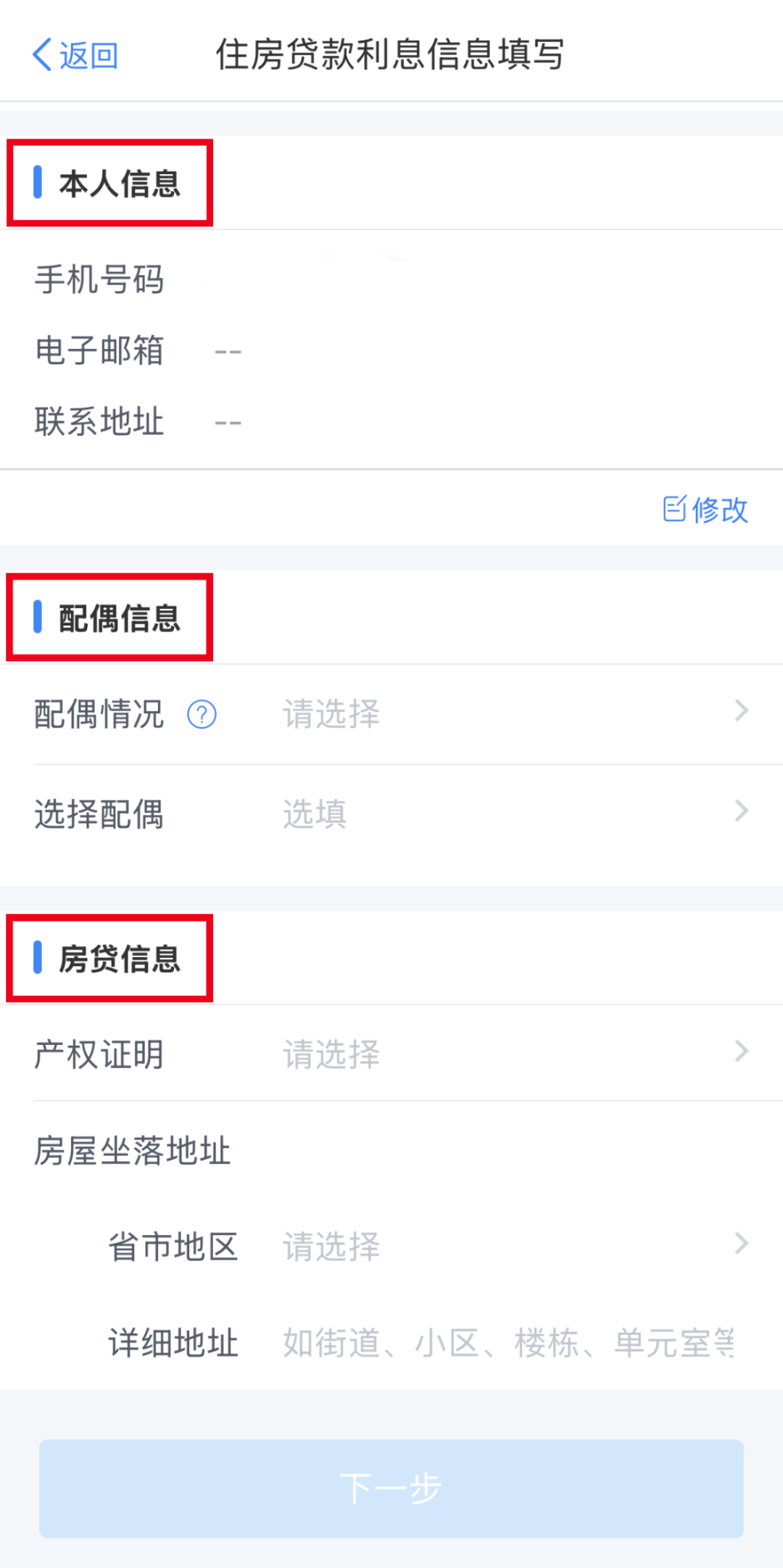 確認“本人信息”,填寫“配偶信息”,選擇“產(chǎn)權證明”,完善“房貸信息”,點擊“下一步”;