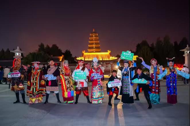 活動(dòng)當(dāng)晚,身著傳統(tǒng)藏族服飾的西藏演藝人員在西安地標(biāo)大雁塔下開(kāi)展快閃活動(dòng),千年絲路文明與雪域高原文化在此交相輝映。