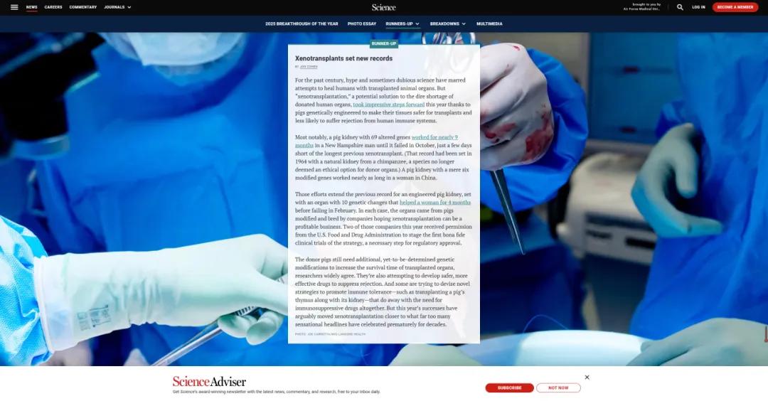該創(chuàng)新成果的介紹概述中提到:今年,異種移植取得關(guān)鍵突破。借助基因工程改造的豬器官,研究人員顯著延長(zhǎng)了動(dòng)物器官在人體內(nèi)的存活時(shí)間。一名美國(guó)患者接受的69處基因改造豬腎在體內(nèi)工作近9個(gè)月,刷新工程化豬腎移植紀(jì)錄;在中國(guó),一名女性移植的僅改造6個(gè)基因的豬腎也維持了幾乎同樣長(zhǎng)的時(shí)間。這些成果遠(yuǎn)超此前維持紀(jì)錄,盡管挑戰(zhàn)猶存,今年的突破無(wú)疑讓異種移植距離真正走向臨床應(yīng)用更近一步。