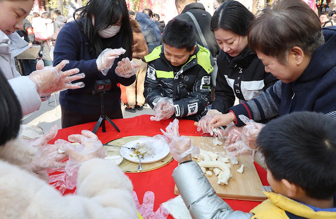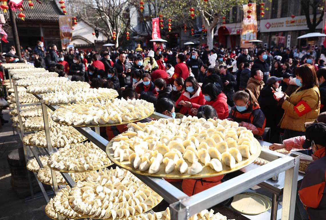 熱氣騰騰的餃子出鍋后,工作人員迅速分裝,免費派送到游客手中。咬上一口,鮮香的餡料裹挾著熱湯入口,暖意瞬間傳遍全身,大家邊吃邊聊,陌生的游客因為一碗餃子拉近了距離,整個廣場都沉浸在團(tuán)圓的氛圍里。