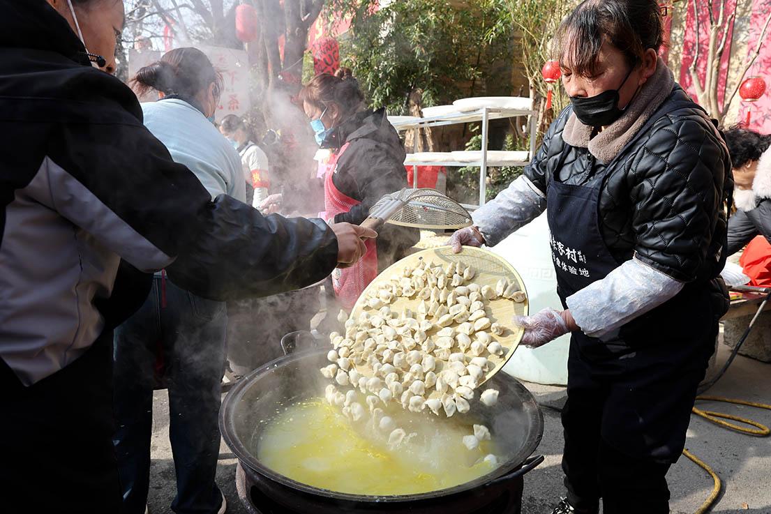 隨著活動總管王志俊的一聲令下,10口大鍋同時開火,沸水翻滾間,一批批餃子下鍋,瞬間激起陣陣白霧?!斑@邊5個鍋,那邊5個鍋,一個鍋能煮350個餃子,5個鍋同時煮,不停輪換,保證大家不用等太久。”王志俊指著忙碌的灶臺區(qū)介紹,旁邊18名工作人員正有條不紊地引導(dǎo)游客排隊取餐,秩序井然又不失熱鬧。